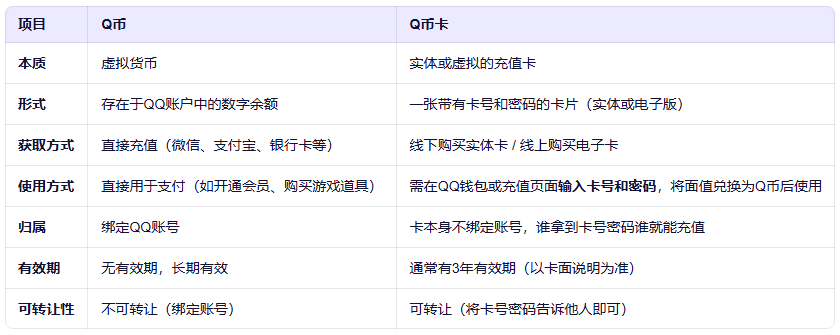 4、Q币可直接用于支付(如开通汇元、购买游戏道具等),Q币卡则需要在QQ钱包或充值页面输入卡号和卡密,将面值兑换为Q币后方可使用